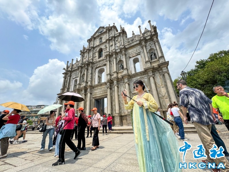 資料圖為穿著漢服的遊客在澳門大三巴牌坊打卡留念。香港中通社圖片 旅客主要經關閘口岸入境,其次是港珠澳大橋和橫琴口岸。假期錄得日均約60萬人次出入境,較去年同期增加12.7%;入境旅客則錄得日均12.1萬人次,較去年同期增加兩成三。假期最後一天,錄得9.8萬人次旅客離境。 澳門特區政府旅遊局局長文綺華表示,受暴雨影響,旅客雖未達預期的日均13萬人次,但在新措施下,旅遊業界可以推出更多兩地聯遊的新產品,豐富旅遊市場,令旅客有更多選擇,去不同澳門景點參觀消費。(完) 【編輯:胡雪石】