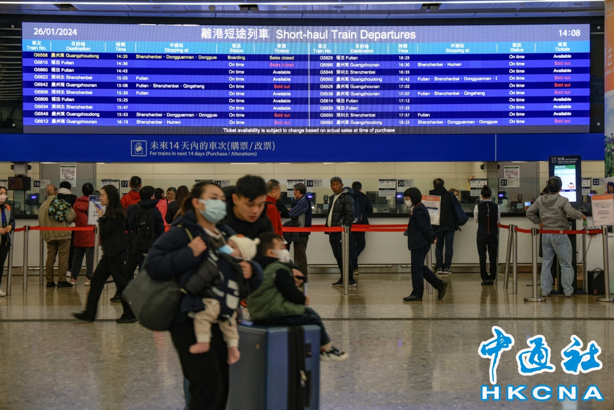 香港中通社資料圖片 統計數據顯示,自春運啟動至1月24日,內地往返香港的跨境客流累計達到100.2萬人次,日均客流量高達9.1萬人次。在這其中,香港與廣東各地市的客流往來尤為頻繁,佔比高達66.1%。主要出行方向集中在香港與深圳、廣州、潮汕等地市。特別是在週末時段,跨境高鐵成為了眾多旅客旅遊觀光、探親訪友的重要選擇,為粵港澳大灣區的旅遊業發展注入了新的活力與動能。