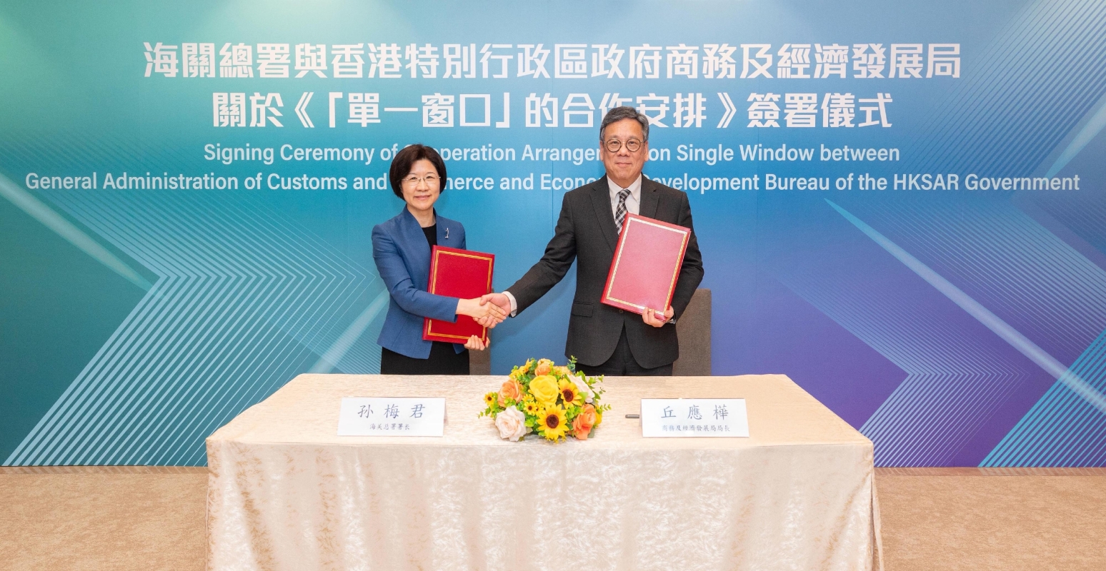 簽署儀式。圖源:政府新聞處 丘應樺表示,內地為香港最大的貨物貿易夥伴,兩地跨境貿易頻繁,高效便捷的貨物清關流程尤其重要。單一窗口為業界提供一站式電子平台,以提交各類報關和貨物清關所需貿易文件,是貿易便利化重要措施。 他續說,局方與香港海關就單一窗口的發展與海關總署保持緊密聯繫,並透過專家小組與內地當局交流經驗和探討合作機會。簽署合作安排將推進兩地單一窗口的對接和合作至新台階,優化現行交流合作機制,並探索不同合作領域。 商經局分三階段實施單一窗口,第一與第二階段先後於2020年和2023年全面投入服務,涵蓋42類貿易文件,第三階段服務將於明年分批推出,屆時系統將與內地單一窗口對接。 為推動兩地便利貨物清關,海關總署與香港海關去年11月推出內地與香港貨物一單兩報,覆蓋所有經陸路口岸從內地進口香港的貨物,以助企業節省申報所需時間及人力,降低運作成本。一單兩報19日起全面覆蓋所有經陸路口岸進出兩地的貨物,進一步便利業界和提升效率。該措施將於單一窗口第三階段服務延續。(完) 【編輯:彭玉婷】