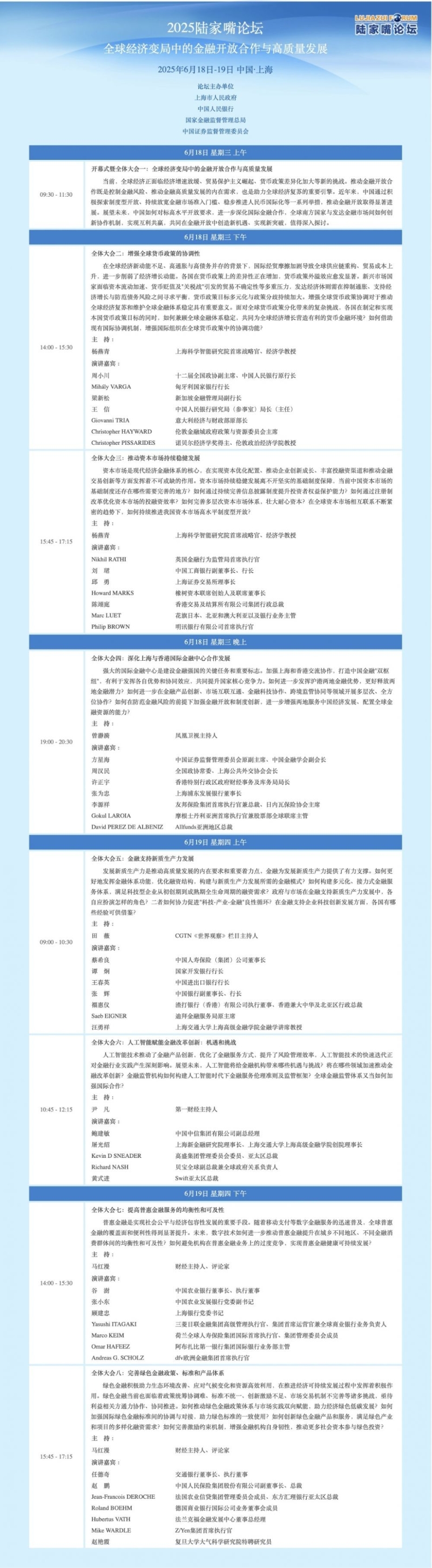 香港新聞網6月18日電 主題為“全球經濟變局中的金融開放合作與高質量發展”的上海陸家嘴論壇今日如約而至。國家金融監督管理總局、證監會、國家外匯局局等金融管理部門負責人將與來自10多個國家和地區的70餘名金融界人士探討推進金融開放與合作。根據此前消息,2025陸家嘴論壇期間,中央金融管理部門將發佈若干重大金融政策。而香港是論壇重頭戲之一。 將發佈重大金融政策 香港是重頭戲之一 根據最新議程(見下圖),在“全體大會四:深化上海與香港國際金融中心合作發展”上,香港特別行政區政府財經事務及庫務局局長許正宇將與中國證監會原副主席、中國金融學會副會長方星海等嘉賓就上述話題進行探討。 強大的國際金融中心是建設金融強國的關鍵任務和重要標誌。加強上海和香港交流協作,打造中國金融“雙樞紐”,有利於發揮各自優勢和協同效應,共同提升國家核心競爭力。 據上海市政府新聞發佈會日前透露的消息,2025陸家嘴論壇期間,中央金融管理部門將發佈若干重大金融政策。滬港國際金融中心協同發展將是重頭戲之一。論壇期間,上海與香港將簽署《滬港國際金融中心協同發展行動方案》。 而在“全體大會三:推動資本市場持續穩健發展”上,上海證券交易所理事長邱勇也將與香港交易及結算所有限公司集團行政總裁陳翊庭同台,就如何持續推進我國資本市場高水平制度型開放等話題進行探討。 中外金融界人士商討八大主題 2025陸家嘴論壇由中國人民銀行、國家金融監督管理總局、中國證監會和上海市人民政府共同主辦,由中國人民銀行行長潘功勝與上海市市長龔正擔任共同輪值主席。中國人民銀行行長潘功勝將在稍後召開的論壇上致開幕辭并作主題演講。國家金融監督管理總局局長李雲澤、證監會主席吳清、國家外匯局局長朱鶴新等金融管理部門負責人以及上海市人民政府的領導也將發言。 近年來,中國通過積極探索制度型開放、持續放寬金融市場准入門檻、穩步推進人民幣國際化等一系列舉措,推動金融開放取得顯著進展。在為期兩天的2025陸家嘴論壇期間,與會中外金融界人士將圍繞金融開放合作與高質量發展的主題進行探討(見下圖會議議程)。