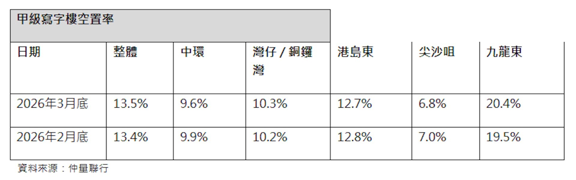 仲量聯行今天發表的《香港地產市場觀察》報告中指出,3月份本港甲級寫字樓空置率兩極化情況加劇,月內中環及尖沙咀空置率雖見改善,惟其他分區市場空置率上升,推高整體甲級寫字樓空置率於3月底升至13.5%。