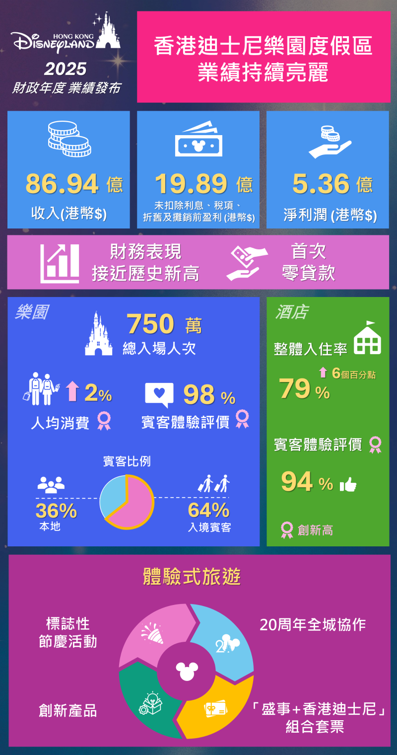 香港新聞網4月28日電 香港迪士尼樂園度假區28日公布2025財政年度業績,樂園收入、未扣除利息、稅項、折舊及攤銷前盈利(EBITDA)及淨利潤均接近歷史高位。樂園全年入場人次合共750萬,酒店整體入住率約為80%。 香港迪士尼錄得穩健的財務表現,淨利潤為5.36億港元,收入為 86.94 億港元,未扣除利息、稅項、折舊及攤銷前盈利(EBITDA)為19.89 億港元。樂園方面指出,鑒於香港出境旅遊需求迅速恢復、宏觀經濟環境持續不確定,以及香港在 2025 年經歷極端天氣,訪港旅客的出行模式和到訪意欲均受影響。在此情況下,香港迪士尼的表現尤其值得肯定。