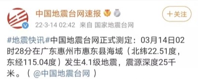 有香港市民凌晨感受到地震 這是怎麼一回事? 【字幕】3月14日02時28分,廣東省惠州市惠東縣海域發生4.1級地震,香港多區居民均表示感受到震動,紛紛在社交媒體上查詢與分享感受,有人從睡夢中驚醒,有人目睹家具震動,幸無人員傷亡。