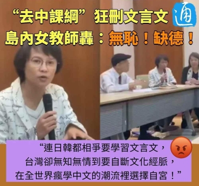 這個課綱它的直接影響我分兩方面,一方面就所謂的“台獨”課綱這裡來講,它當然是去中國化,在國文、在歷史、在地理、在公民各方面都置入性地去行銷(推廣)“台獨”的概念。國文直接受到的影響就是篇幅大加刪減,大加刪減的狀況之下,對學生直接的影響就是他的語文能力下滑得非常嚴重。
