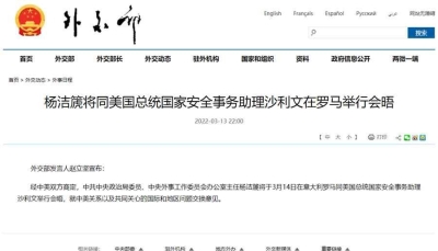 【字幕】同美國總統國家安全事務助理沙利文3月14日在意大利羅馬舉行會晤。 【字幕】雙方就中美關係以及共同關心的國際與地區問題進行了坦誠、深入和建設性溝通, 【字幕】同意共同落實好兩國元首共識,增進瞭解,管控分歧,擴大共識,加強合作, 【字幕】為推動中美關係重回健康穩定發展的正確軌道積累條件。 【字幕】楊潔篪表示,落實兩國元首共識是中美關係最重要的任務。 【字幕】楊潔篪強調,台灣問題事關中國的主權和領土完整,就涉疆、涉藏、涉港等問題闡明中方嚴正立場。 李俊樂 報道 |