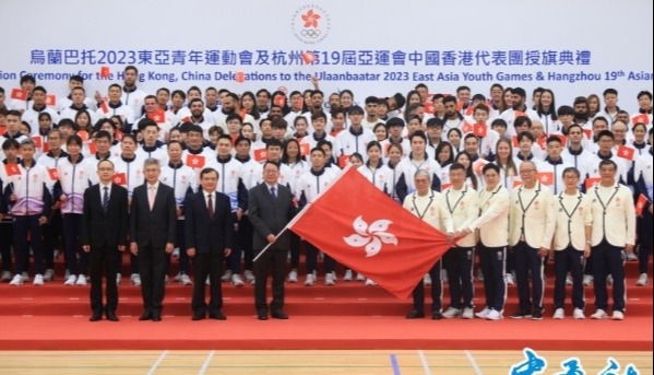 【字幕】7月25日,烏蘭巴托2023東亞青年運動會及杭州第19屆亞運會中國香港代表團授旗典禮舉行,香港特區政府政务司司长兼署理行政长官陈国基现身授旗,杭州第19屆亞運會將於9月23日至10月8日舉行,中國香港今次合共派出约681名运动员出戰,人數是歷年之冠。 【編輯:陈烁】