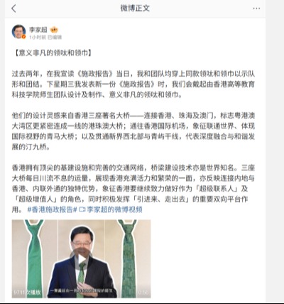 過去兩年,在我宣讀《施政報告》當日,我和團隊均穿上同款領呔和領巾以示隊形和團結。下星期三我發表新一份《施政報告》時,我們會戴起由香港高等教育科技學院師生團隊設計及制作、意義非凡的領呔和領巾。 他們的設計靈感來自香港三座著名大橋——連接香港、珠海及澳門,標志粵港澳大灣區更緊密連成一線的港珠澳大橋;通往香港國際機場,象征聯通世界、體現國際視野的青馬大橋;以及貫通新界西北部與青嶼幹線,代表深度融合與和諧發展的汀九橋。 香港擁有頂尖的基建設施和完善的交通網絡,橋梁建設技術亦是世界知名。三座大橋每日川流不息的運量,展現香港充滿活力和繁榮的一面,亦反映連接內地與香港、內聯外通的獨特優勢,象征香港要繼續致力做好作為“超級聯繫人”及“超級增值人”的角色,同時積極發揮「引進來、走出去」的重要雙向平台作用。 編輯 付鈺 相關新聞 |