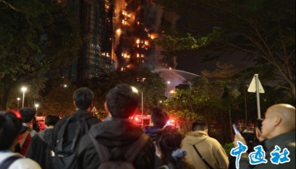 【字幕】香港大埔宏福苑11月26日突發火警,火勢迅速蔓延波及屋苑七座住宅,至下午6時22分升為五級火,入夜後現場多棟大廈仍陷入火海、冒出濃煙。記者27日早晨在現場看到,大火已受控制,但仍有個別房間有火光未滅。截至清晨6時,火警至今造成44死58傷,死者包括一名殉職消防員。