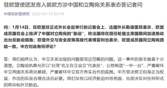 歐盟再撐立陶宛 稱準備通過反經濟脅迫法案香港中通社2月14日電(香港中通社記者 張婕舒)歐盟輪值主席國、法國貿易部長弗蘭克·里斯特在法國當地時間13日聲稱,針對立陶宛和中國可能爆發的貿易戰,歐盟堅定支持立陶宛。並承諾歐盟將快速通過反經濟脅迫法案,賦予歐洲新的權力進行反擊。受訪學者直言,這一法案主要針對中國,不過生效後美國也可能成為實施對象,對歐盟也會造成反噬。