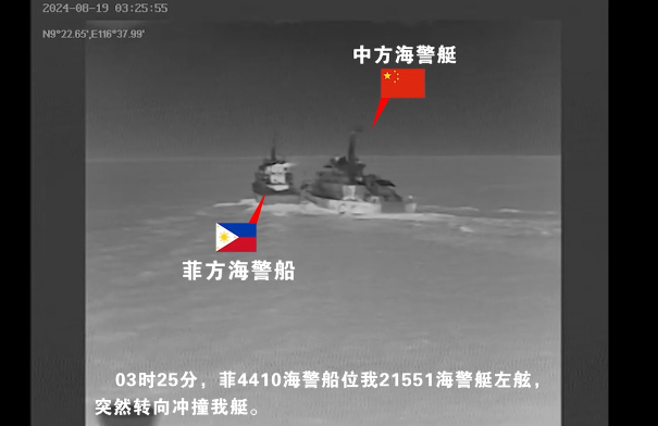 香港中通社8月19日電(香港中通社記者 李明珠)菲律賓海警船19日非法衝闖仙賓礁鄰近海域,故意衝撞中方正常維權執法的海警艇,相關行動受阻後,菲海警船再次非法衝闖仁愛礁附近海域。受訪學者指出,菲律賓在仙賓礁的動作已經常態化,試圖增加新的突破點,多點突擊分散中國的注意力,緊張局勢或將進一步升溫。 中國海警局新聞發言人甘羽表示,8月19日,菲律賓4410、4411號海警船未經中國政府允許,非法闖入中國南沙群島仙賓礁鄰近海域,中國海警依法對菲船只採取管控措施。03時24分,菲4410號船無視中方多次嚴正警告,以不專業、危險方式,故意衝撞中方正常維權執法的21551艇,導致發生擦碰,責任完全在菲方。