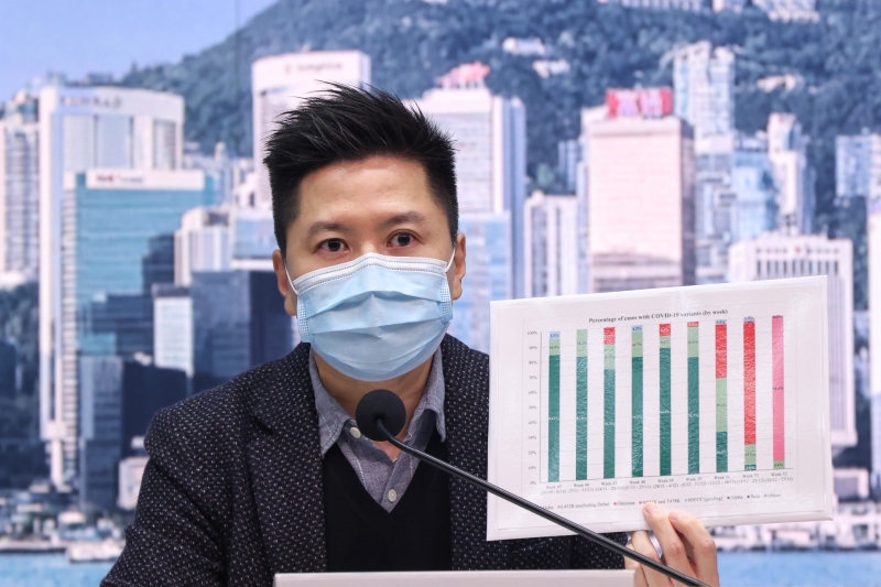 香港衛生防護中心總監徐樂堅在疫情簡報會上展示目前香港疫情情況(香港中通社記者 許其皓)