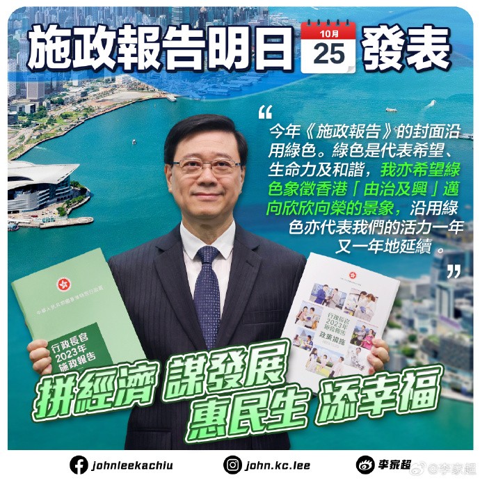(圖源:李家超微博) 精心謀劃,把發展的“餅”做大 發展經濟如同做餅,餅子愈大,每個人有機會分得愈多。香港的“餅”大小如何呢?應該說,過去數年,“泛政治化”和隨之而來的三年疫情阻滯了香港的發展,香港的“餅”還不夠大,市民期待特區政府加快“做餅”的速度。時下,儘管香港經濟發展遭遇困難不少,但香港的底子好、前景闊。 第一,香港拚經濟有明顯優勢。現年95歲高齡的李嘉誠先生每每回憶起故友李光耀先生都會真情流露,敬重之情溢於言表。前不久,李嘉誠先生談起李光耀先生時眼裏仍閃着淚光。他說,李光耀生前曾經感慨地說:“羨慕香港緊靠中國內地的地理位置,時刻都想新加坡和香港能調換位置。”這其實道出了新加坡與香港的差別。新加坡和香港都是國際化大都市,但香港是世界上唯一一個集中國優勢和國際優勢於一身的城市,而新加坡不是。 香港的“中國優勢”主要體現在背後有祖國的強力支撐。中國是世界第二大經濟體,是世界第一貿易大國和第一製造業大國,特別是粵港澳大灣區建設為香港發展提供了廣闊腹地,香港發展的天地不再是1100平方公里的範圍,香港應以更寬視野謀劃未來發展。香港的“國際優勢”主要體現在“一國兩制”,由於“兩制”之別,香港依然保持普通法,依然是“自由港”,依然能吸引國際頂尖人才,“國際城市”的成色未減、魅力依然。 第二,香港拚經濟有寬闊出路。有人憂慮歐美資本和人才撤走給香港經濟帶來負面影響,這種憂慮是可以理解的,但也要看大局、看趨勢。其一,要看到這種現象是暫時的,還是長期的?香港回歸前,也有歐美資本和人才撤離香港,後來這些資本和人才又回流香港,因為,“香港已死”的預言破產了,他們捨不得香港的發展機遇。其二,要看到新興市場國家和發達國家之間的力量消長。 時下,世界經濟“西降東升”已成趨勢。東盟已成為香港的第二大貿易夥伴;區域全面經濟合作夥伴關係協定(RCEP)對於香港下一步發展至關重要,東盟可幫助香港盡早加入;共建“一帶一路”國家的“硬聯通”和“軟聯通”在下一個十年的需求旺盛;隨着新能源佔據的市場份額愈來愈大,世界各產油大國普遍尋求經濟轉型……這些變化為香港開拓新市場提供了空前機遇。 期盼新一份《施政報告》把香港的兩大優勢把握得更精準,把發展的眼界放得更寬,不拘泥於1100平方公里,不拘泥於歐美資本,不拘泥於過往的經驗,而應以大格局、大氣魄、大手筆來謀劃新發展。 用足“工具”,把民生實事辦好 中央非常關注香港的民生問題,特區政府過去一年也非常努力,但由於民生欠賬太多,各方利益協調的難度還是不小,改善民生的進度仍然可以加快推進,市民期待新一份《施政報告》會有讓人眼前一亮的新舉措,給惠民生再加一把力。 以解決“住房難”為例,出現的問題五花八門。有的反對把公屋建設在自己的社區旁邊,因為壓縮了自己的空間;有的反對公屋建在邊遠的區域,因為交通不方便;有的反對“簡易公屋”建設,因為成本太高;還有的人擔心公屋建設加快會拉低房價,使自己的資產縮水。總而言之,說起“劏房”、“籠屋”,人們普遍表示同情,認為這不應該是“東方之珠”的“標記”,但要增加公屋供應量以消除“劏房”、“籠屋”,許多人的態度就變了。眼下,“行政主導”已得到切實落實,政府解決“住房難”的辦法其實很多,包括提請立法會對有關問題制定法例,從“立規矩”做起,把這件實事辦好。 又以“北上養老”為例。香港的老齡化程度愈來愈嚴重,安老事務是特區政府高度關注的重點領域。本港65歲以上的長者當中有很多人來自內地,對內地有一份故土情份,中國人素有“落葉歸根”的心理,這是內因。現在,反中亂港勢力挑撥香港與內地的現象銷聲匿跡了,疫情期間香港與內地隔絕的狀態也消除了,再加上大灣區建設加快推進,大灣區廣東9市的居住環境和居民生活有明顯優勢,這是外因。在內因和外因的雙重作用下,長者“北上養老”的願望會更加強烈。那麼,特區政府如何為“北上養老”搭橋鋪路呢?特別是醫療領域的“接軌”最為重要,應該有突破性的措施。 一年多來,特區政府“以結果為目標”施政,對於大多數市民來說,最關心民生領域的目標和結果,包括住房、安老、扶貧、就醫、社區環境提升,等等。期待第二份《施政報告》惠民生的力度比第一份更大一些,針對過去一年遇到的“堵點”、“卡點”,把“工具箱”裏的“工具”用足用夠,讓更多的民生實事盡快落地見效。 居安思危,把安全根基築牢 過去幾年,香港人吃了不少苦。先是“動亂之苦”,2019年的“修例風波”令香港社會秩序大亂,損失慘重;後是“封閉之苦”,三年疫情期間,香港與內地、與世界隔絕,民生困頓。今年,香港終於復常了,市民再也不想過苦日子了,人們渴望社會安定和諧。無論是拚經濟,還是惠民生,沒有安定的社會環境都不行。期待特區政府把安全的根基築牢。 築牢安全的根基,當務之急是重塑區議會。區議會“去政治化”可根除亂源,從根本上提升基層治理水平,這一點市民普遍支持。市民主要關注兩點:其一,做好“把關”的工作。把“愛國者治港”落到實處,不能讓反中亂港分子“入閘”。其二,做好監督考核區議員履職的工作。區議會將回歸“非政權組織”屬性,但大部分區議員由委任和間接選舉產生,市民擔心