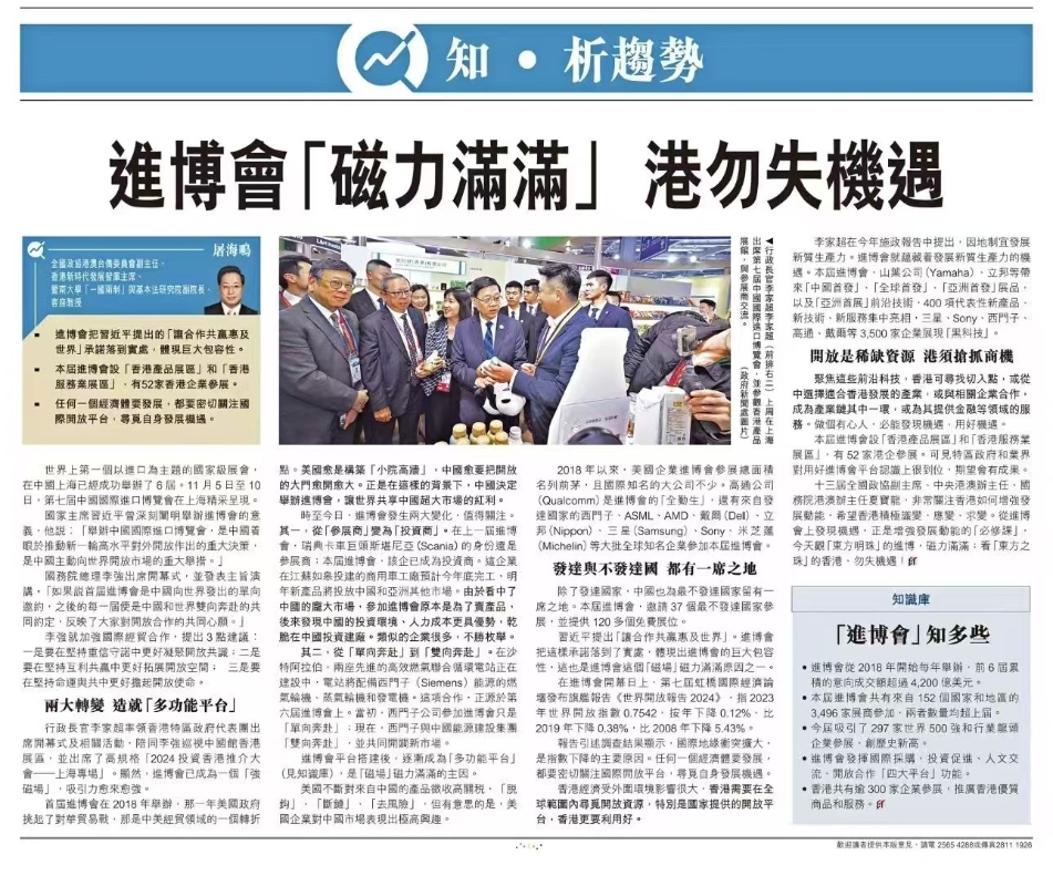 行政長官李家超率領香港特區政府代表團出席開幕式及相關活動,陪同國務院總理李強巡視中國館香港展區,並出席了高規格“2024投資香港推介大會——上海專場”。今次進博會,香港共有逾300家企業參展,推廣香港優質商品和服務。 進博會從2018年開始,每年舉辦一屆,前6屆進博會累積的意向成交額超過4200億美元。本屆進博會共有來自152個國家和地區的3496家展商參加,國別(地區)數和企業數均超上屆;吸引了297家世界500強和行業龍頭企業參展,創歷史新高;39個政府交易團和4個行業交易團,共計780個分團到會採購,數量為歷屆之最 。 顯然,進博會已成為一個“強磁場”,吸引力越來越強。 兩大轉變,造就“多功能平台” 首屆進博會是2018年舉辦的。眾所周知,那一年,美國政府挑起了對華貿易戰,那是中美經貿領域的一個轉折點。 美國越是構築“小院高牆”,中國越要把開放的大門越開越大。正是在這樣的背景下,中國決定舉辦進博會,讓世界共享中國超大市場的紅利。 時至今日,進博會發生兩大變化,值得關注。 其一,從“參展商”變為“投資商”。在上一屆進博會上,瑞典卡車巨頭——斯堪尼亞的身份還是“參展商”;本屆進博會上,該企業已經成為“投資商”。這個企業在江蘇如皋投建的商用車工廠預計2024年底完工,2025年新產品將投放中國和亞洲其他市場。由於看中了中國的龐大市場,參加進博會原本是為了賣產品,後來發現中國的投資環境、人力成本更具優勢,乾脆在中國投資建廠。類似的企業很多,不勝枚舉。 其二,從“單向奔赴”到“雙向奔赴”。在沙特阿拉伯,兩座先進的高效燃氣聯合循環電站正在建設中,電站將配備西門子能源的燃氣輪機、蒸汽輪機和發電機。這項合作,正源於第六屆進博會上。當初,西門子公司參加進博會只是“單向奔赴”;現在,西門子與中國能源建設集團“雙向奔赴”,並共同開闢新市場。 進博會平台搭建後,逐漸成為“多功能平台”。如今,進博會成功發揮國際採購、投資促進、人文交流、開放合作“四大平台”功能,成為構建新發展格局的窗口、推動高水平開放的平台、全球共享的國際公共產品。這是進博會這個“磁場”磁力滿滿的主要原因。 最發達和最不發達國家,都有一席之地 美國不斷對來自中國的產品徵收高關稅,“脫鈎”“斷鏈”“去風險”,但有意思的是,美國企業對中國市場表現出極高興趣。 2018年以來,美國企業進博會參展總面積名列前茅,且國際知名的大公司不少。高通公司(Qualcomm)是進博會的“全勤生”,今年展示以“5G+AI”為代表的先進技術,賦能千行百業的創新實踐。高通公司中國區董事長坦言:“中國不僅是潛力巨大的市場,更是與生態夥伴建立強有力合作、在全球市場實現共贏的機遇之地。” 來自發達國家的西門子、ASML、AMD、戴爾、立邦、三星、索尼、米其林等一大批全球知名企業參加本屆進博會。 除了發達國家, 中國也為最不發達國家留有一席之地。本屆進博會,邀請37個最不發達國家參展並提供120多個免費展位,擴容非洲產品專區,虹橋論壇為最不發達國家包容性增長建言獻策…… 習主席提出“讓合作共贏惠及世界”。進博會把這樣承諾落到了實處,體現出進博會的巨大包容性,這也是進博會這個“磁場”磁力滿滿的原因之一。 開放是稀缺資源,港須搶抓機遇 在11月5日進博會開幕日上,第七屆虹橋國際經濟論壇發佈旗艦報告《世界開放報告2024》,其中的主要信息值得關注。 報告顯示,2023年,世界開放指數0.7542,同比下降0.12%,比2019年下降0.38%,比2008年下降5.43%。 報告引述一份調查結果顯示,“國際地緣衝突擴大”是世界開放指數下降的主要原因,另外還有“國家安全概念泛化”、“逆全球化、反全球化思潮抬頭”、“單邊主義、霸凌措施增多”等。 在世界開放指數持續下降的背景下,開放變成了稀缺資源。任何一個經濟體要發展,都要密切關注國際開放平台,尋覓自身發展機遇。 香港經濟受外圍環境影響很大,香港需要在全球範圍內尋覓開放資源,特別是國家提供的開放平台,香港更要利用好。 李家超在2024年施政報告中提出,因地制宜發展新質生產力。進博會就蘊藏著發展新質生產力的機遇。前六屆進博會已有近2500項代表性首發新產品、新技術、新服務亮相。本屆進博會上,雅馬哈、立邦等企業將帶來“中國首發”、“全球首發”、“亞洲首發”展品以及“亞洲首展”前沿技術,400項代表性新產品、新技術、新服務集中亮相,三星、索尼、西門子、高通、戴爾等3500家企業展現“黑科技”。 聚焦這些前沿科技,香港可以尋找切入點,或從中選擇適合香港發展的產業,或與相關企業合作,成為產業鏈中的一環,或為其提供金融等領域的服務。總之,做個有心人,必能發現機遇、用好機遇。 本屆進博會上設立了“香港產品展區”和“香港服務業展區”,有52家香港企業參展,涵蓋食品、創新科技、專業服務、物流、資訊科技、貿易和金融等領域。由此可見,特區政府和業界對用好進博會平台認識上很到位,期望會有成果。 十三屆全國政協副主席、中央港澳辦主任、國務院港澳辦主任夏寶龍去年4月和今年2月兩次來港調研,非常關注香港如何增強發展動能,希望香港積極識變、應變、求變。從進博會上發現機遇,正是增強發展動能的“必修課”,今天觀“東方明珠”的進博,磁力滿滿;看“東方之珠