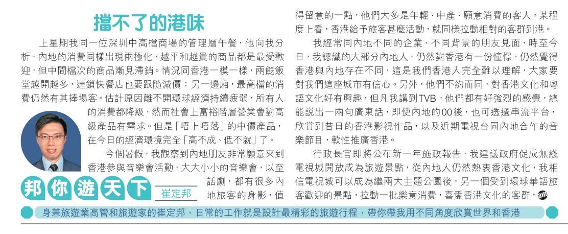 擋不住的港味 上星期我同一位深圳中高檔商場的管理層午餐,他向我分析,內地的消費同樣出現兩極化,越平和越貴的商品都是最受歡迎,但中間檔次的商品漸見滯銷。情況同香港一模一樣,兩餸飯堂越開越多,連鎖快餐店也要跟隨減價;另一邊廂,最高檔的消費仍然有其捧場客。估計原因離不開環球經濟持續疲弱,所有人的消費都降級,然而社會上富裕階層營業會對高級產品有需求。但是“唔上唔落”的中價產品,在今日的經濟環境完全“高不成、低不就”了。 今個暑假,我觀察到內地朋友非常願意來到香港參與音樂會活動,大大小小的音樂會,以至話劇,都有很多內地旅客的身影,值得留意的一點,他們大多是年輕、中產、願意消費的客人。某程度上看,香港給予旅客甚麼活動,就同樣拉動相對的客群到港。 我經常同內地不同的企業、不同背景的朋友見面,時至今日,我認識的大部分內地人,仍然對香港有一份憧憬,仍然覺得香港與內地存在不同,這是我們香港人完全難以理解,大家要對我們這座城市有信心。另外,他們不約而同,對香港文化和粵語文化好有興趣,但凡我講到TVB,他們都有好強烈的感覺,總能說出一兩句廣東話,即使內地的00後,也可透過串流平台,欣賞到昔日的香港影視作品,以及近期電視台同內地合作的音樂節目,軟性推廣香港。 行政長官即將公布新一年施政報告,我建議政府促成無綫電視城開放成為旅遊景點,從內地人仍然熱衷香港文化,我相信電視城可以成為繼兩大主題公園後,另一個受到環球華語旅客歡迎的景點,拉動一批樂意消費,喜愛香港文化的客群。 (本文作者為香港旅遊促進會總幹事崔定邦) (本文僅代表作者觀點,不代表本媒體立場) 【編輯:譚暢】