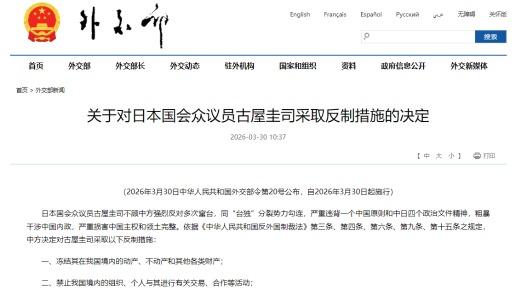 3月30日中國外交部發表了對日本眾議員古屋圭司采取嚴厲反制措施的決定,這是針對古屋圭司在前不久竄到台灣,發表要“保護台灣”等狂妄語言,同島內賴清德為首的“台獨”分裂勢力沆瀣一氣的行為發出嚴重警告,不允許日本等外國政黨和個人以台灣問題干涉中國內政。古屋是日本殖民當局官員的養子,戰後80年來依舊抱著對台灣殖民統治的陰魂不散,長期活躍在日本政壇借台灣問題干涉中國內政,想借軍國主義思潮回潮重溫殖民舊夢,實為痴心妄想。