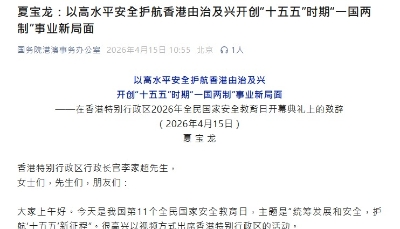 【來論】屠海鳴:夏寶龍“四個需要”為香港高水平護航國家安全提綱挈領昨天是我國第11個全民國家安全教育日,主題是“統籌發展和安全,護航‘十五五’新征程”。昨天上午,香港特區2026年“全民國家安全教育日”活動開幕典禮在香港會展中心舉行。中央港澳工作辦公室主任、國務院港澳事務辦公室主任夏寶龍在開幕典禮上以視頻方式發表致辭。香港特區行政長官、特區維護國家安全委員會主席李家超,中央政府駐港聯絡辦主任、特區維護國家安全委員會國家安全事務顧問周霽等分別致辭。