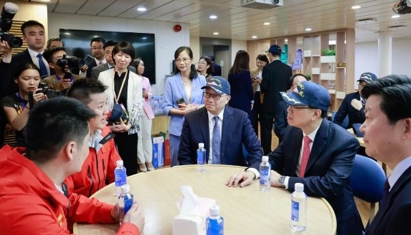 “雪龍2”號的船長及船隊成員向碼頭迎候的市民熱情揮手,隨後緩緩駛入香港尖沙咀海運碼頭停泊。