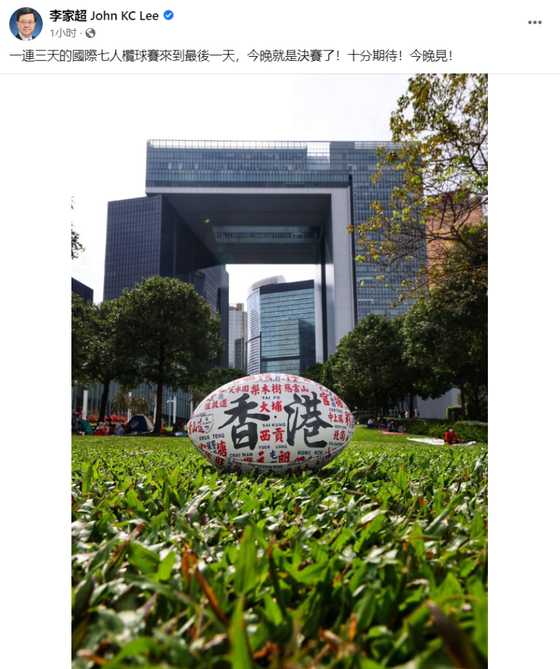 香港新聞網11月6日電 香港特區行政長官李家超今日(6日)在社交媒體發文稱,一連三天的國際七人欖球賽來到最後一天,今晚就是決賽了!十分期待!今晚見!