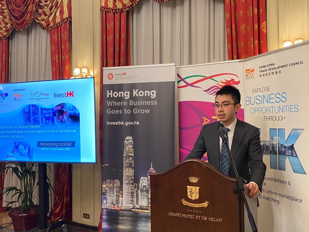 意大利米蘭舉行的商務研討會。政府新聞處圖片 駐布魯塞爾經濟貿易辦事處副代表蔡禧揚在意大利米蘭舉行的商務研討會上,向意大利企業家推廣香港醫療保健領域的機遇。政府新聞處圖片 駐布魯塞爾經濟貿易辦事處副代表蔡禧揚在意大利米蘭舉行的商務研討會上,向意大利企業家推廣香港醫療保健領域的機遇。政府新聞處圖片 今次是繼11月10日及11日在香港舉行的亞洲醫療健康高峰論壇後,駐布魯塞爾經貿辦在歐洲籌辦的第二場活動。駐布魯塞爾經貿辦於西班牙馬德里時間15日在當地亦舉辦了類似的商務研討會。駐布魯塞爾經貿辦副代表蔡禧揚,簡介了行政長官在今年的《施政報告》中有關香港未來在醫療保健領域的政策重點,並強調科技將發揮重要作用。 蔡禧揚指出,香港已是全球領先的生物科技公司籌資中心,其發展成熟的創業及業務擴展生態系統,更吸引了健康科技公司在港發展業務。 初創公司Pedius行政總裁、意大利企業家Lorenzo Di Ciaccio在研討會上分享了他在香港的成功故事。該公司在香港設立地區辦事處,利用先進的語音識別科技開發了一個流動應用程式,使聽障人士能夠自行使用電話通話。 【編輯:孟宜君】