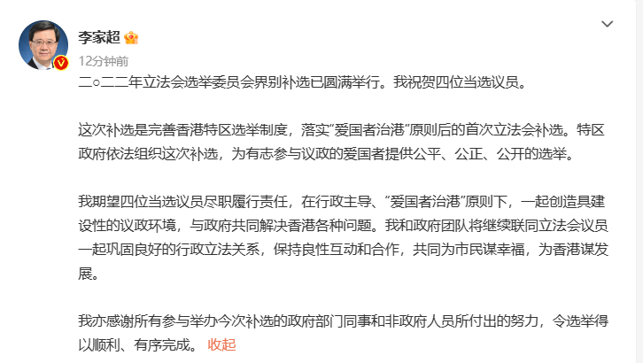 李家超微博截圖 李家超指出,這次補選是完善香港特區選舉制度,落實“愛國者治港”原則後的首次立法會補選。特區政府依法組織這次補選,為有志參與議政的愛國者提供公平、公正、公開的選舉。 李家超期望四位當選議員盡職履行責任,在行政主導、“愛國者治港”原則下,一起創造具建設性的議政環境,與政府共同解決香港各種問題。李家超表示,自己和政府團隊將繼續聯同立法會議員一起鞏固良好的行政立法關係,保持良性互動和合作,共同為市民謀幸福,為香港謀發展。 李家超亦感謝所有參與舉辦今次補選的政府部門同事和非政府人員所付出的努力,令選舉得以順利、有序完成。 【編輯:王瑶】