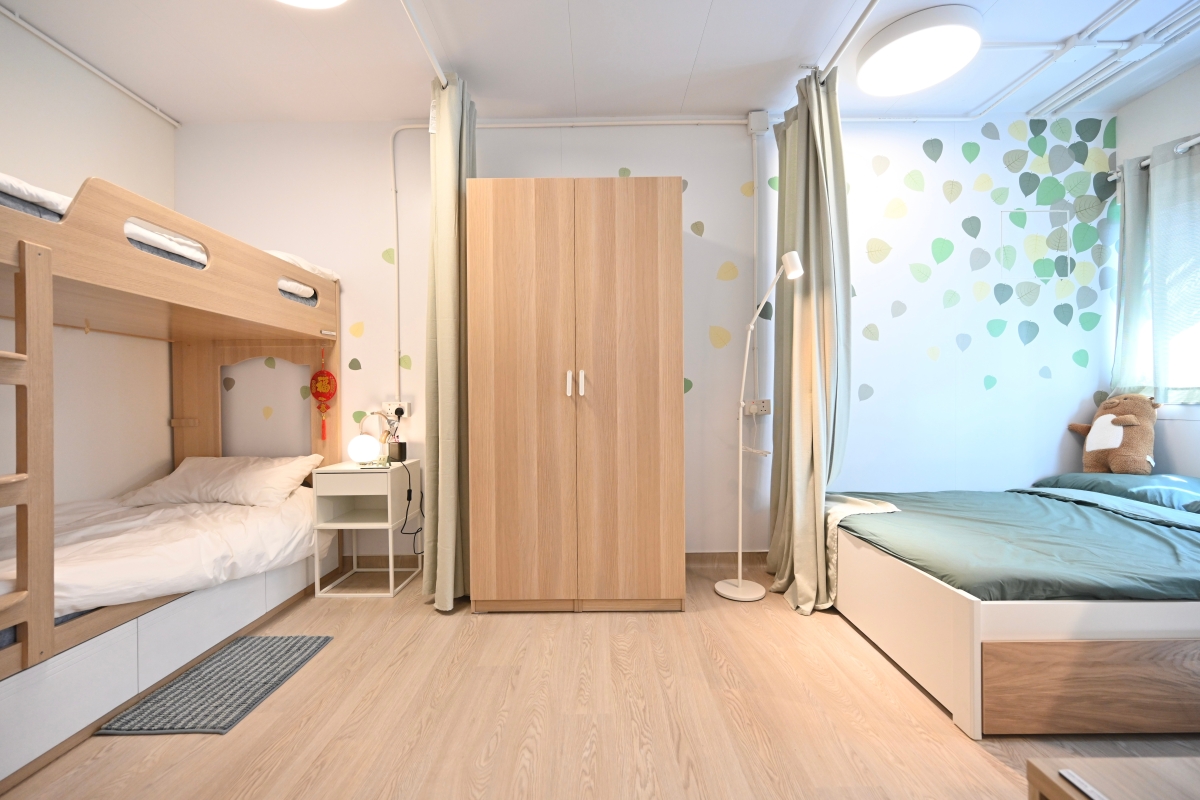 “簡約公屋”示範單位內部情況 另外,傳媒亦參觀了啟德世運道的“簡約公屋”用地。該用地預計可提供超過10,000個“簡約公屋”單位。“簡約公屋”示範單位設於啟德社區隔離設施內,模擬一個4至5人單位,設有獨立洗手間、淋浴間和開放式煮食空間,配備電熱水爐和抽氣扇等基本設備。“簡約公屋”將提供不同大小單位,室內樓面面積介乎約13至31平方米,包括可供1至2人入住的細單位、3至4人及4至5人居住的大單位。