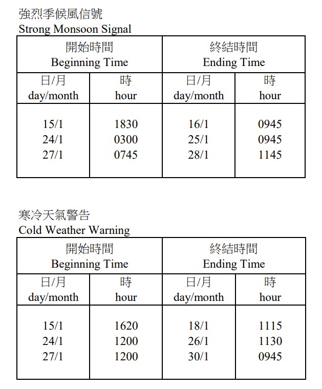 2023年1月發出的警告及信號(來源:香港天文台) 一道冷鋒於1月15日早上橫過廣東沿岸,本港當日大致多雲,氣溫顯著下降,初時亦有幾陣雨及部分地區有霧。受東北季候風影響,1月16日及17日本港多雲及天氣寒冷。1月18日早上本港天氣仍然寒冷,在一股大陸氣流影響下,當日及1月19日本港天氣轉為大致天晴及乾燥。受一股偏東氣流及一道覆蓋廣東沿岸的雲帶影響,1月20日至22日本港部分時間有陽光及有幾陣雨。在微風情況下,1月23日本港部分時間有陽光及局部地區能見度頗低。