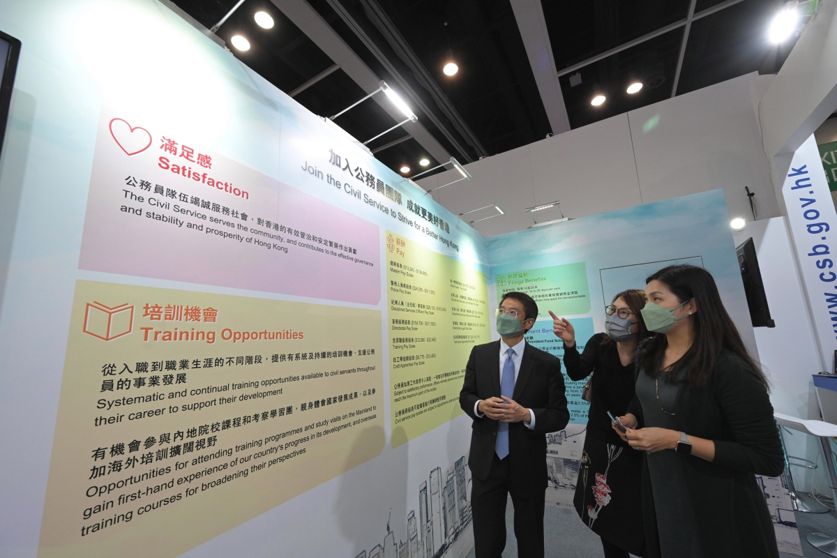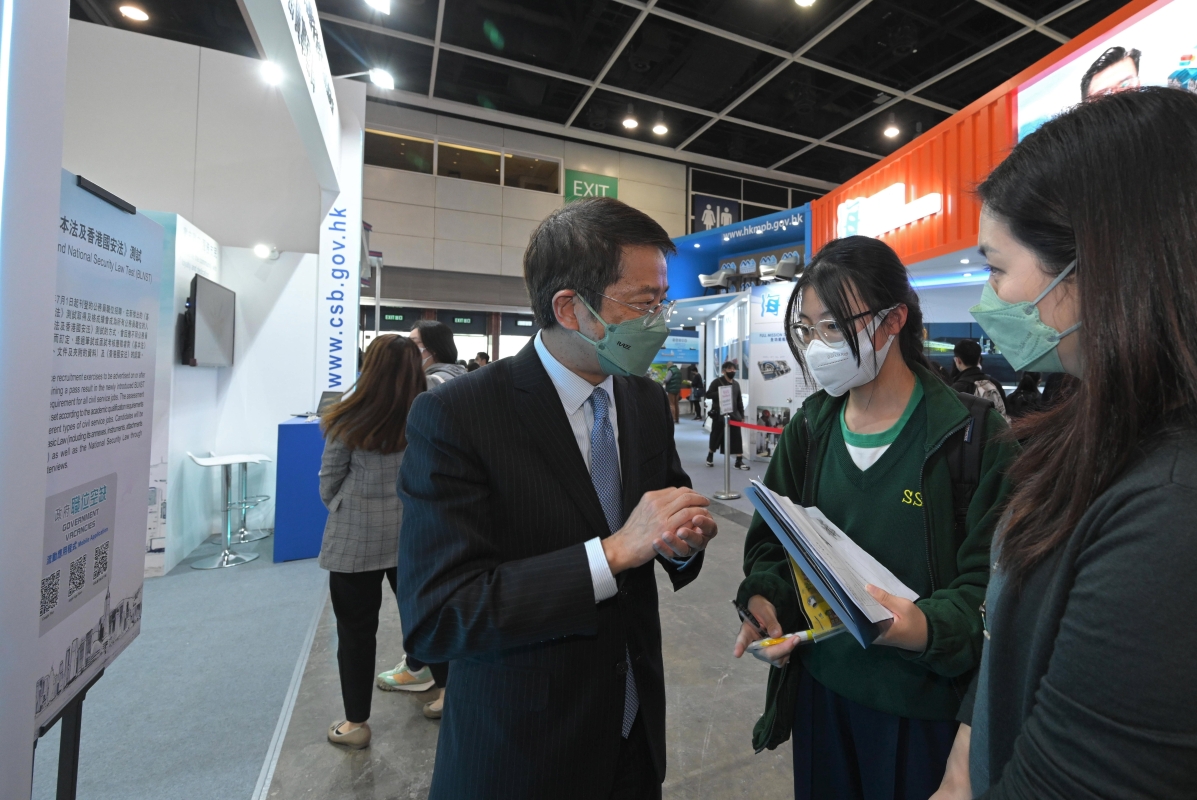 梁卓文(左)到場參觀 公務員事務局於今日(2月3日)下午3時30分至下午4時在展覽廳1E的交流廣場舉辦“認識政務主任和行政主任職系”講座,由現職政務主任和行政主任介紹兩個職系的求職技巧、實習計劃以及事業發展前景,歡迎有意投考上述職系的人士參與。 為確保新聘的公務員對《基本法》及《香港國安法》有基本的認識,由去年7月1日起展開的公務員職位招聘,申請人均須取得《基本法及香港國安法》測試及格成績,方會獲考慮聘用。為讓入場人士了解《基本法及香港國安法》測試,公務員事務局的攤位特設有模擬試題問答遊戲,參加者會獲得紀念品,送完即止。 “教育及職業博覽2023”即日起至2月5日在香港會議展覽中心展覽廳1D&E舉行,免費入場。公務員事務局攤位設於展覽廳1D,編號為1D-C10。有關公務員招聘事宜,請參閱公務員事務局網頁:www.csb.gov.hk/tc_chi/recruit/7.html。 【編輯:黃璇】