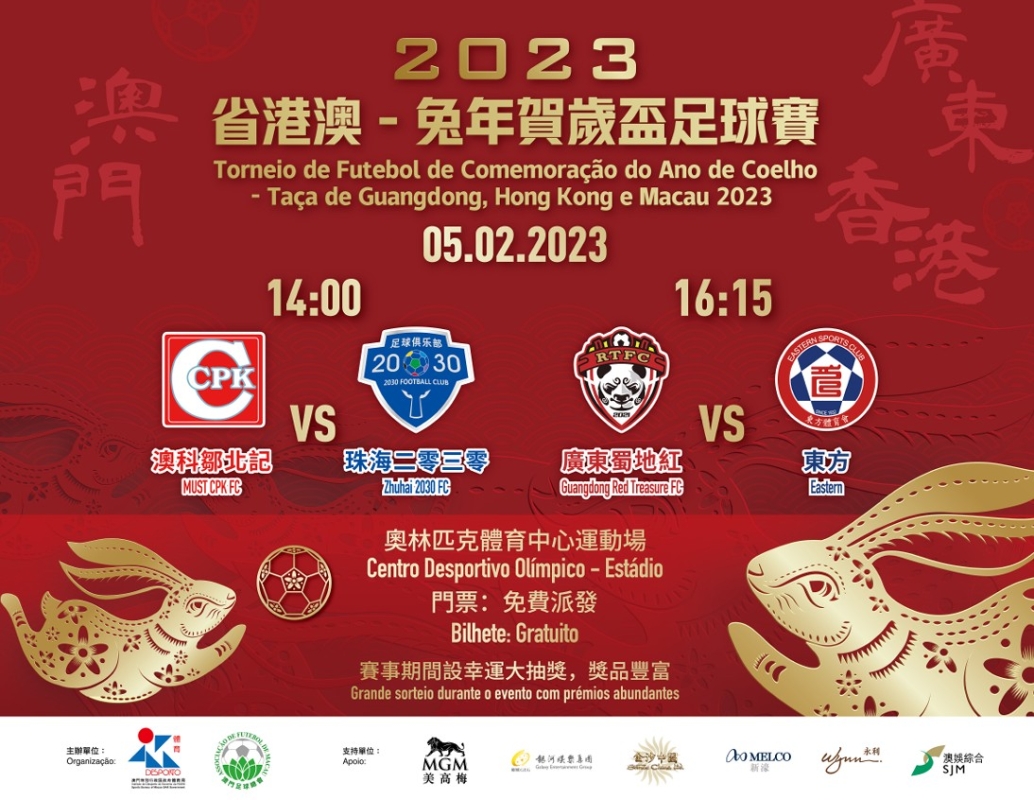 香港新聞網2月3日電 為與市民喜迎癸卯兔年,歡度新春佳節,由澳門特區政府體育局與澳門足球總會合辦的“2023省港澳-兔年賀歲盃足球賽”將於2月5日(星期日)在奧林匹克體育中心運動場(氹仔奧林匹克大馬路)舉行,賽事當天下午2時率先由澳科鄒北記對珠海2030,緊接4時15分由廣東蜀地紅對東方。 比賽當日設有抽獎環節,球迷需憑票進場參加抽獎,屆時將由本澳六家綜合度假休閒企業送出禮品,共賀新歲。