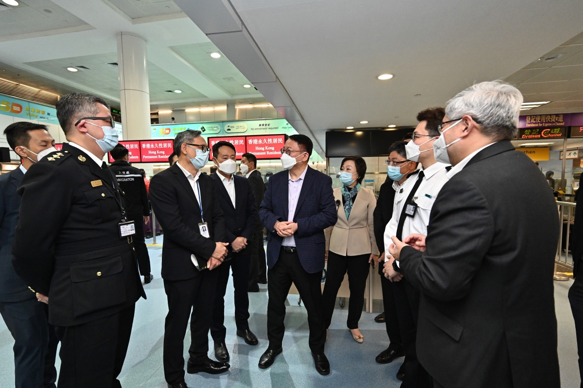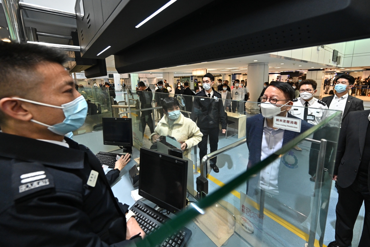 陳國基(左四)今早到羅湖管制站視察 陳國基表示,隨着香港與內地自今日起全面通關,全部口岸投入運作,並不設每日人數安排和出行前核酸檢測要求,促成兩地人民跨境往來全面復常。全賴香港特別行政區(特區)政府與相關業界機構充分合作,加上與中央和粵、深政府相關單位緊密協調,各海、陸、空口岸,包括新開放的口岸整體運作良好,往來口岸的本地交通配套亦到位。今日截至中午12時,共約83,000名旅客使用各陸路口岸過關,即約50,000名北上旅客和約33,000名南下旅客。 視察期間,陳國基聽取羅湖管制站相關部門同事匯報離境人士的分流程序、入境事務處的過關服務,以及海關為旅客進行的清關安排。他欣悉口岸秩序良好,並指示各相關部門同事密切留意人流情況,做好人流管理,尤其是在星期六、日和假期此等一般較多人過關的日子,確保口岸運作安全、有序和順暢。 在交通配套方面,陳國基指示口岸相關部門與各公共交通工具營辦商保持緊密聯繫,確保有足夠公共交通服務於口岸開放時間內接載旅客往來口岸。他亦提醒相關部門與港鐵公司保持緊密合作,密切監察羅湖管制站和落馬洲支線管制站的人流和實際情況,按需要實施乘客管理措施和調整班次,協助疏導乘客,確保相關港鐵站和口岸的安全和秩序。