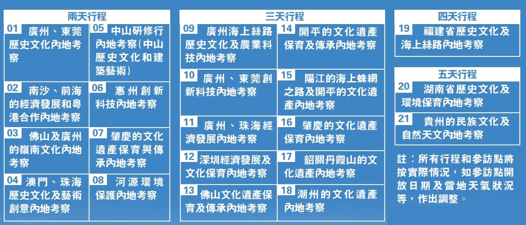 教育局早前推出的21個內地考察行程選擇 考察團師生比為1:10,容許中五生考察團額外增加一至兩名隨團教師。今次新增的10個行程中,一日團佔8個,目的地分別為廣州、深圳、佛山及珠海,涉及歷史文化、創新及航天科技等主題。當中“深圳歷史文化及創新科技內地考察”行程中包括到訪東江縱隊紀念館、深圳智慧生活創想館或龍崗區科技館,以及考察創新科技企業等。