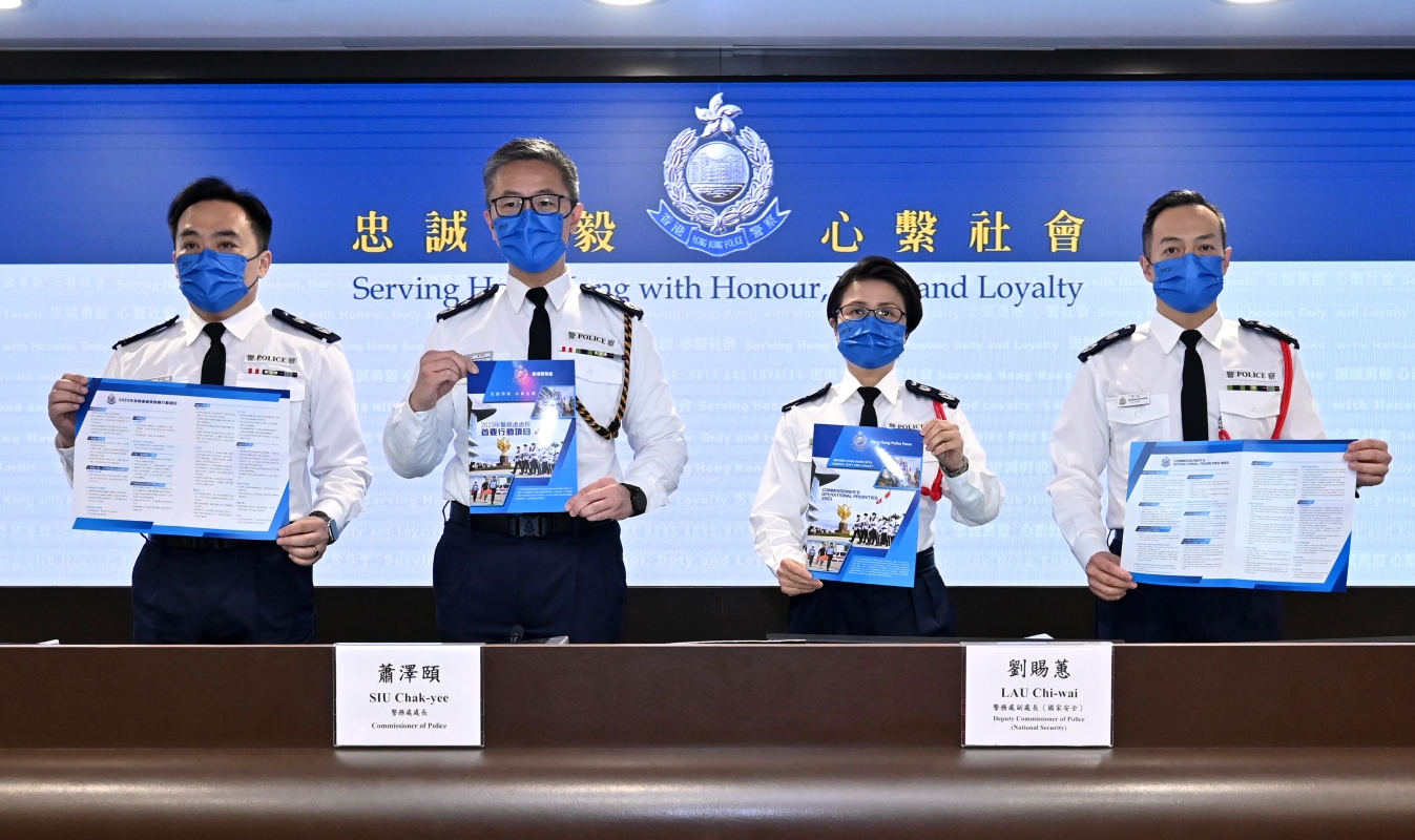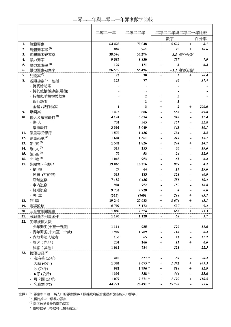 警務處處長蕭澤頤(左二)回顧2022年香港的治安情況及警務工作 1. 整體形勢 2022年錄得的整體罪案數字是70,048宗,比2021年增加5 620宗(+8.7%)。整體破案率為百分之35.2。整體罪案上升,主要是由於詐騙案增加了八千多宗。 當中,暴力罪案則有8,830宗,減少757宗(-7.9%)。多項主要罪案均錄得顯著跌幅,包括性罪行、刑事恐嚇、刑事毁壞、嚴重毒品罪行及車內盜竊等。 行劫及爆竊案件的宗數更是1969年有紀錄以來最低,而傷人及嚴重毆打、縱火、搶掠及扒竊案件數字則是自回歸以來的新低。 2. 兇殺 2022年兇殺案有30宗,增加了7宗(+30.4%),當中15宗涉及家庭或親屬間的暴力,全部案件已被偵破。 3. 詐騙 詐騙案件數字的升幅顯著,有27,923宗,上升百分之45.1(+8 674宗),當中超過七成涉及網上騙案。升幅主要來自“網上購物騙案”(8,735宗)、“求職騙案”(2,996宗)、“投資騙案”(2,850宗)及“電話騙案”(2,831宗),分別錄得四成至1.8倍的升幅。其中,“投資騙案”及“電話騙案”涉及的金額仍然龐大,分別超過18億元及10億元,情況令人關注。 “反詐騙協調中心”持續發揮效用,勸止超過500宗騙案受害人匯出騙款,並攔截逾13億元騙款。同時,警方加強情報主導的打擊行動,成功瓦解多個詐騙集團,拘捕約1,300人。其中代號“高岸”的行動,共偵破410宗電話騙案,拘捕205人,成功攔截超過二千萬元。 除執法外,警方亦與通訊事務管理局辦公室及流動網絡營辦商於去年9月成立專責工作小組,制訂打擊電話騙案措施,包括協助用戶過濾並堵截可疑來電。 警隊透過多渠道宣傳防騙訊息。去年主要的宣傳活動包括“防騙季”、“喜怒哀‘落’”、“反洗黑錢月”、“全民反詐大測試”等活動,以不同主題、不同角度剖析騙徒犯案手法和宣傳防騙訊息。 警方去年推出的“防騙視伏器”(Scameter)資料庫,協助市民分辨可疑來電及電郵等資料。為了更便利市民使用,警方研發並將推出防騙視伏器的應用程式“Scameter+”。 4. 勒索 勒索案有1,826宗,比2021年增加234宗(+14.7%),升幅主要來自“裸聊”勒索案件,共1,402宗。 去年,警方加強相關宣傳,包括舉行大型“網絡安全博覽2022”,並正舉行“全城守網”網絡安全運動。 5. 三合會相關罪案 三合會相關罪案錄得2 554宗,上升666宗(+35.3%),升幅主要來自涉及詐騙、嚴重賭博罪行、擅自取去交通工具及促使/操控賣淫的案件。 警方一直關注三合會相關的非法活動。就去年發生涉及黑社會的嚴重暴力案件,警方即時加強與相關政府部門及內地執法機構協作,大部分案件已被偵破。去年亦進行大型“反三合會行動”,又在世界盃舉行期間展開反非法賭博行動,拘捕1,000多人。同時加強打擊三合會分子操控賣淫及參與詐騙,拘捕超過200人及偵破超過300宗騙案。 6. 行劫及爆竊 行劫及爆竊案持續錄得顯著跌幅。行劫案大幅下跌三成七,至77宗,破案率七成四。 爆竊案亦大幅下跌四成,有886宗,破案率四成三,是過去46年的新高。警方會繼續進行以情報主導的行動及靈活調配資源打擊相關罪案。 7. 性罪行 強姦案下跌三成三至53宗,非禮案亦減少65宗(-6.4%)至953宗。強姦及非禮案維持高破案率,達百分之百及百分之80.9。警方會繼續留意性罪行趨勢,聯同各持份者進行針對性的宣傳教育。 8. 嚴重毒品罪行 嚴重毒品案有1,436宗,減少134宗。警方去年持續進行打擊行動,“冰”毒、可卡因及大麻的檢獲量均錄得升幅。當中包括9月破獲歷來檢獲量最大的905公斤大麻花(市值約1.9億元)。 9. 青少年罪行 2022年,因干犯刑事罪行而被捕的青少年(10至20歲)有2,774人,按年下跌百分之8.2(-247人)。當中涉及學生被捕的數字更按年下跌百分之11(1,620人,-200人),學生涉及行劫(-80.6%)、嚴重毒品罪行(-40%)、店鋪盜竊(-36%)及刑事毀壞(-16.7%)的人數均錄得顯著跌幅,反映過去一年警隊與校長、老師、家長及相關持份者緊密協作,確實讓學童對相關案件的警覺性有所提升。 雖然因嚴重毒品罪行而被捕的學生錄得四成跌幅(78人,-52人),但仍然有17名13至14歲的學童被毒犯利用販毒而被捕。“一宗青少年罪案都嫌多”,警方需要社會各界攜手合作,預防青少年受罪犯利用。 此外,年輕人可能受損友的誤導和影響,或為了“揾快錢”而被不法分子利誘參與違法活動。去年年輕人干犯詐騙案包括提供銀行戶口收取詐騙款項及涉及三合會罪行均錄得升幅。 去年,警方推出《青少年罪行誌.師長攻略》小冊子,為老師、家長及青少年提供應對策略及防罪訊息,又製作分別以網絡陷阱、騙案為主題的電子書和動畫繪本,並推廣至全港中、小學。針對預防青少年涉毒問題,警方剛啟動第二屆“禁毒領袖學院”計劃。今年,警方會繼續透過多個渠道加強年輕人的守法意識。 10. 《香港國安法》執法情況 截至2022年12月31日,警方拘捕236人,當中超過140人已被檢控。