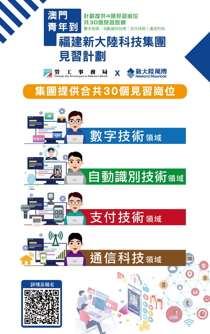 30個見習崗位由集團旗下四家企業提供 計劃為期3個月,見習地點位於福建省福州市,崗位涵蓋數字技術、自動識別技術、支付技術及通信科技等領域,分別由集團旗下四家企業提供合共30個見習崗位。新大陸科技集團長期從事科技創新和創新成果市場轉化的高科技企業,産品和服務已覆蓋全球上百個國家和地區。見習活動由企業派資深業務代表以在崗帶教模式進行,有志投身高新科技行業發展的青年朋友,勿失良機。 申請可於本月22日前網上遞交 申請從速 計劃為配合澳門特區政府“1+4”適度多元發展策略,優化產業結構而加快培養產業人才推出,凡於申請截止當日(2月22日)未滿35歲、且於2019年或之後完成高等教育課程並取得學位,又具備見習崗位所需專業學歷及技能要求的澳門青年,可於2023年2月22日前登入勞工局“澳門青年到福建新大陸科技集團見習計劃”專頁(www.dsal.gov.mo/zh_tw/standard/newland_intern.html)了解詳情及進行網上申請。如欲查詢,可於辦公時間內致電+853 8399 9818(李先生)。 (完) 【編輯:黃璇】