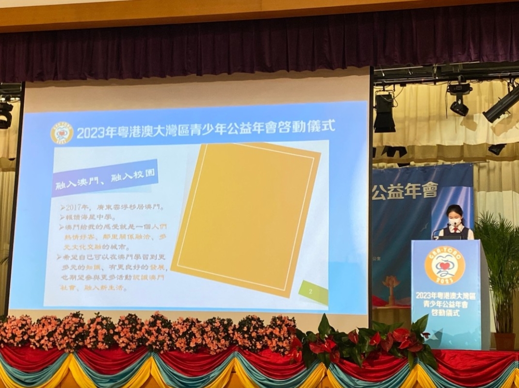 澳門海星中學學生梁倩盈分享經驗 澳門海星中學高二年級學生梁倩盈於“年會”上作澳門青少年代表分享參與公益活動經驗表示,自己身處一個繁榮的時代,既是未來的見證者、參與者,更是建設者,通過參與公益活動履行社會責任,在幫助他人時完善自我是最好的成長方式。