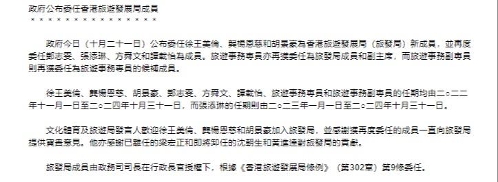 香港新聞網2月22日電 香港特區政府昨公布行政長官委任文化體育及旅遊局局長楊潤雄出任文化委員會主席,亦同時委任下列人士為文化委員會成員,任期兩年,由2023年3月1日起生效: 王英偉(副主席) 鄭志剛 鄭維新 鄭泳舜 周永成 霍啟剛 黑國強 紀文鳳 林顥伊 梁高美懿 李秀恒 羅仲榮 呂汝漢 毛俊輝 黃永光 唐英年 曾志偉 鄭新文 胡陳德姿 楊余夏卿 楊勇 楊政龍 楊偉誠 盛智文 以下三名政府代表亦為文化委員會官方成員: 發展局局長或其代表 教育局局長或其代表 民政及青年事務局局長或其代表 香港特區行政長官在2022年《施政報告》中宣布成立文化委員會。該委員會負責制訂“文藝創意產業發展藍圖”、鼓勵私營市場參與推動文化藝術及創意產業發展的策略,以及推動香港與內地及外地文化藝術交流,實踐成為中外文化藝術交流中心的願景。 (完) 【編輯:黃璇】