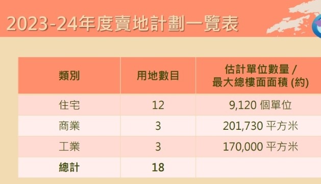 香港特區政府公布2023至24年度賣地計劃香港新聞網2月24日電 香港特區政府發展局局長甯漢豪公布2023至24年度政府賣地計劃。 甯漢豪說:“2023至24年度賣地計劃包含12幅住宅用地,可提供約9,120個住宅單位;3幅商業用地,可提供超過20萬平方米總樓面面積;以及3幅工業用地,可提供約17萬平方米總樓面面積。”