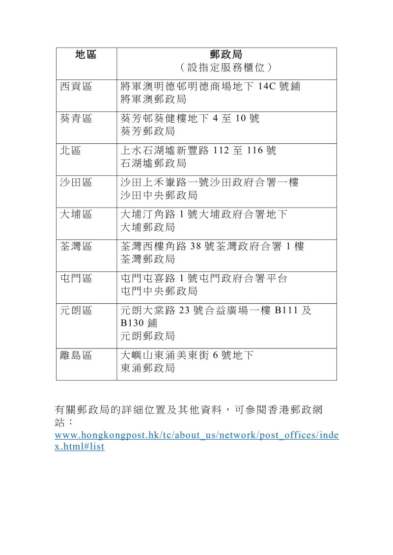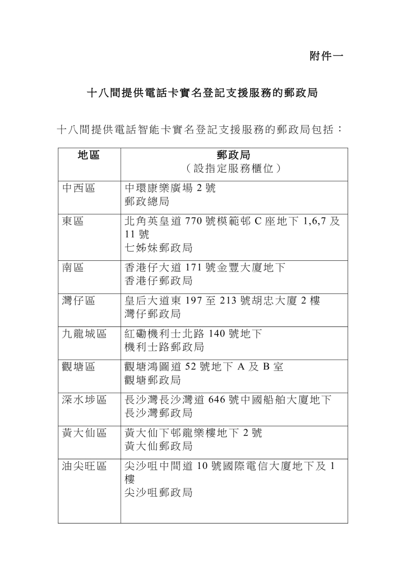 香港新聞網2月24日電 香港特區政府今日(2月24日)宣布,18間指定郵政局(見下圖)所設立的實名登記服務櫃位將於今日和明日(2月25日)分別延長服務時間至晚上7時及下午5時,讓未有在法定限期前完成實名登記而被停用電話儲值卡(即“太空卡”)的用戶補辦登記,以重啓服務。