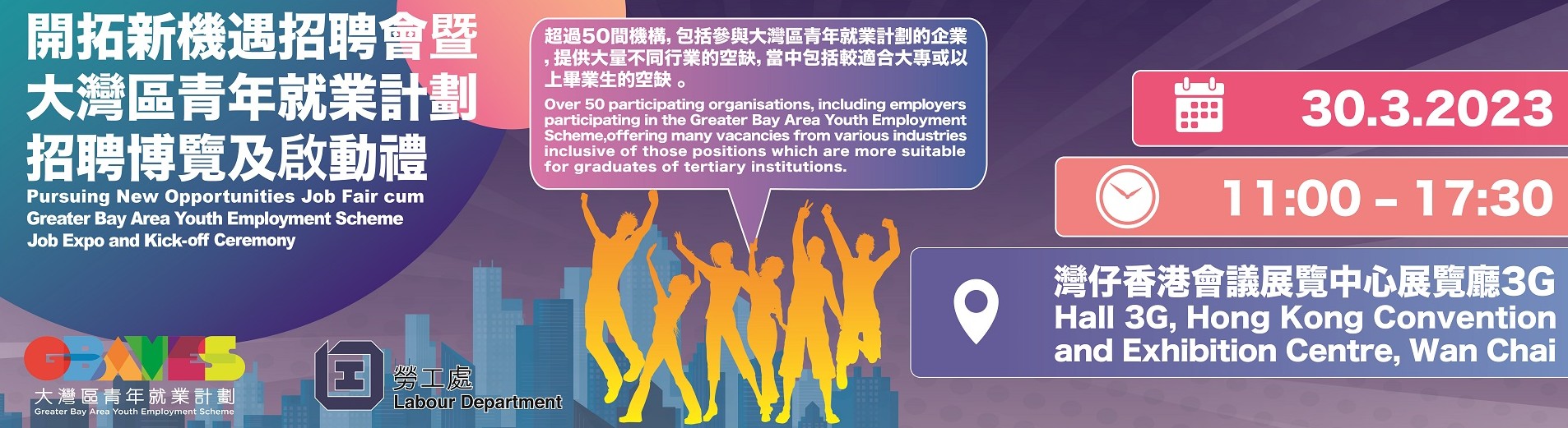 另外,“大灣區青年就業計劃”招聘博覽共有20多間來自不同行業的機構參加,提供超過400個在大灣區內地城市的職位空缺,當中包括管理見習生、行政主管、銀行營運業務員、新聞編輯、產品設計師、工程師和商業智慧分析師等,並以不低於月薪18,000元聘請合資格畢業生。2021至2023年獲頒學士或以上學位的香港居民可以申請有關空缺。“大灣區青年就業計劃”啓動禮及簡介會亦於同日下午2時30分舉行。 求職人士可即場遞交職位申請,有機會即場接受面試,亦可在勞工處設於場內的櫃位查詢該處提供的就業服務。 招聘活動於上午11時至下午5時30分在灣仔香港會議展覽中心展覽廳3G舉行,費用全免。截止入場時間為下午5時。求職人士如欲進一步了解空缺詳情,可瀏覽勞工處的互動就業服務網站www.jobs.gov.hk。 (完) 【編輯:黃璇】