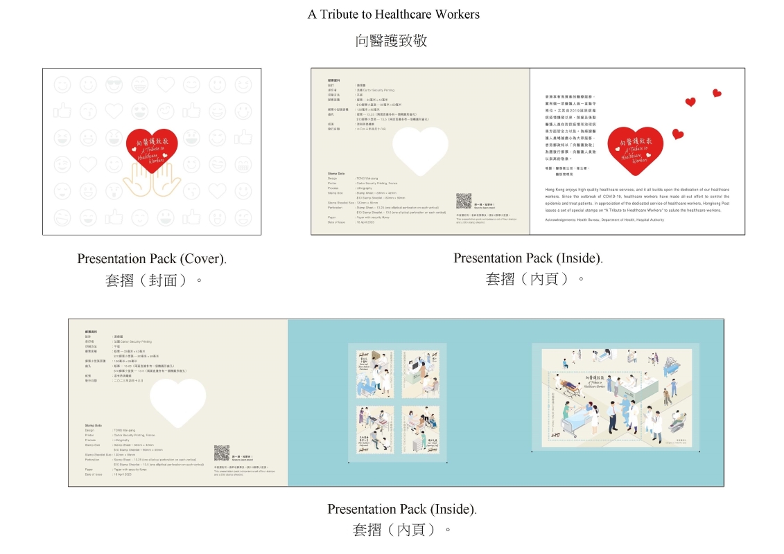 香港郵政4月18日發行以“向醫護致敬”為題的特別郵票及相關集郵品。圖為郵票、郵票小型張和特別郵戳。 香港享有高質素的醫療服務,實有賴一眾醫護人員一直緊守崗位。尤其自2019冠狀病毒病疫情爆發以來,前線及後勤醫護人員在防控疫情和治理病患方面皆全力以赴。為感謝醫護人員竭誠盡心為大眾服務,香港郵政以“向醫護致敬”為題發行一套四枚郵票、一款郵票小型張及相關集郵品,向醫護人員致以崇高的敬意。