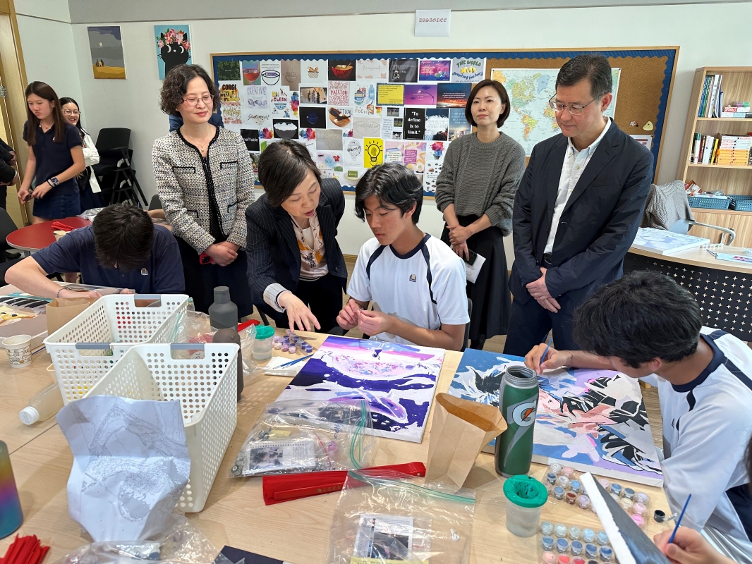 蔡若蓮到訪杭州漢基外籍人員子女學校。圖為蔡若蓮(前排左二)與一名學生交談。 下午,蔡若蓮到訪杭州漢基外籍人員子女學校和杭州綠城育華學校,與在杭香港學生見面,了解他們在當地的學習和寄宿生活,她寄語同學珍惜獨立成長的鍛煉機會,切身感受國家的蓬勃發展。此外,她到訪中國美術學院(象山校區),與學校領導就學術交流與合作、藝術人才培養等交換意見。