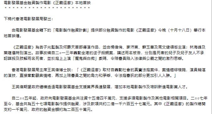 電影《流水落花》宣傳照。 《流水落花》為“首部劇情電影計劃”資助的電影作品,由李嘉慧監製,賈勝楓執導並與羅金翡聯合編劇,由鄭秀文、陸駿光和談善言主演;共獲三項提名,包括最佳女主角、最佳服裝造型設計及最佳原創電影歌曲,最終由鄭秀文及《我這樣活了一天》(流水落花)奪得最佳女主角獎及最佳原創電影歌曲獎。 《正義迴廊》為“電影製作融資計劃”提供融資的電影作品,由翁子光監製,何爵天執導,譚廣源、葉偉平及梁永豪聯合編劇。電影最終由何爵天,以及李謙明、張釗和石繕滎分別奪得新晉導演奬及最佳剪接奬。 “首部劇情電影計劃”透過電影創作及製作計劃比賽,選拔及培育新秀。比賽分為大專組及專業組,各設最多三個獎項,參賽團隊中的導演必須從未執導80分鐘或以上的商業電影。電影發展基金會撥款資助優勝團隊落實得獎的電影計劃,以商業模式拍攝其首部劇情電影。優勝團隊須完成電影策劃、製作、發行等整個電影生產及銷售過程,從中學習籌劃一部劇情電影從創作到實務的知識。 “電影製作融資計劃”旨在為中低成本的電影製作提供融資,以鼓勵商界增加投資電影製作、創造更多的電影活動及就業機會。政府於2020年7月在融資計劃下推出放寛措施以在短期內增加本地電影製作,紓緩電影從業員的困境。鑑於業界對放寛措施的反應熱烈,原定為6個月的申請期限已先後多次延長至2024年1月14日。 (完) 【編輯:黃璇】