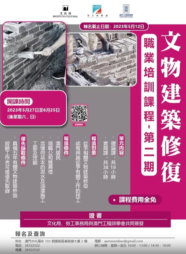 香港新聞網4月19日電 為持續培養澳門文物建築修復人才,澳門文化局、勞工事務局與澳門工程師學會續辦第二期“文物建築修復職業培訓課程”,課程將於5月27日至6月25日期間(逢星期六、日)舉行,課程費用全免,完成課程並通過考核之學員將獲發證書,歡迎現正從事或有興趣從事文物建築修復工作的澳門居民報讀。
