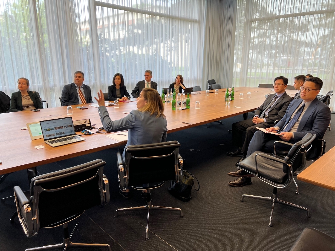 孫東(右二)在瑞士巴塞爾參觀羅氏集團,聽取該集團業務的介紹。 孫東在巴塞爾分別到訪羅氏集團和諾華集團,該兩個製藥集團的成立時間分別可追溯至逾百年及兩個世紀前,均是跨國的製藥及醫療企業。上午,孫東先與羅氏製藥國際部總裁Padraic Ward會面,聽取該集團在製藥及診斷業務的運作,以及在精準醫療方面最新技術的介紹。他知悉香港科技園公司於今年1月與羅氏簽署戰略合作協議,共同引領香港和粵港澳大灣區成為亞太區生命與健康科技的先行示範區,期望有關方面能擴大合作的規模,並鼓勵集團增加在香港的投資。