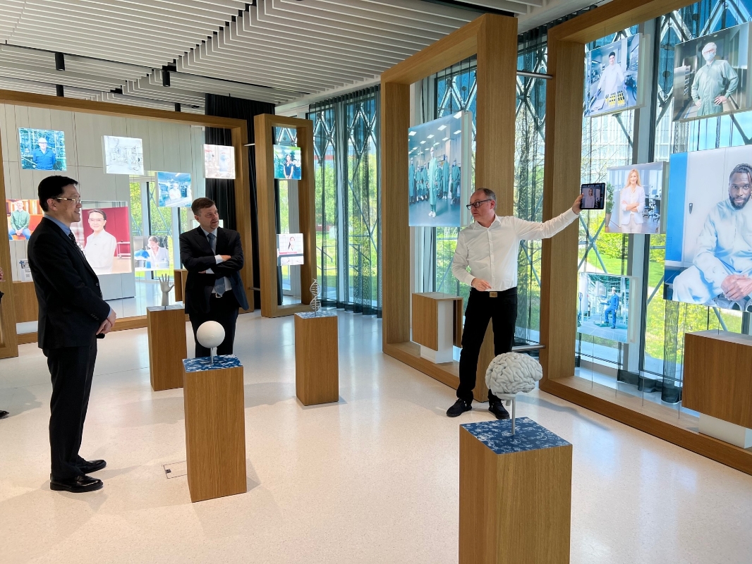 孫東(左一)在瑞士巴塞爾參觀諾華集團的Novartis Pavillon。 孫東下午與諾華集團(中國)總裁貝德年會面,聽取集團在大中華區,包括香港的最新業務發展。諾華集團透過創新科學及技術重塑醫藥,協助解決社會的醫療健康問題。孫東教授表示,香港銳意發展成為國際創科中心,生命健康科技是香港重點發展的策略產業領域之一,他歡迎集團未來加大在香港的業務投資和研發合作。他亦到Novartis Pavillon參觀,該展館以數字化的互動模式展示醫學、醫療和科學發展的過去、現在和未來,推廣科學普及的教育。 孫東亦與多間瑞士當地的生物科技企業高層進行午餐會。孫東教授歡迎他們於今年訪問香港,共同探討更多的發展機會。 孫東傍晚轉往伯恩禮節性拜會中國駐瑞士大使王世廷,向他介紹香港創科發展的最新情況。 孫東於4月28日(伯恩時間)早上前往洛桑繼續瑞士的行程。 (完) 【編輯:黃璇】