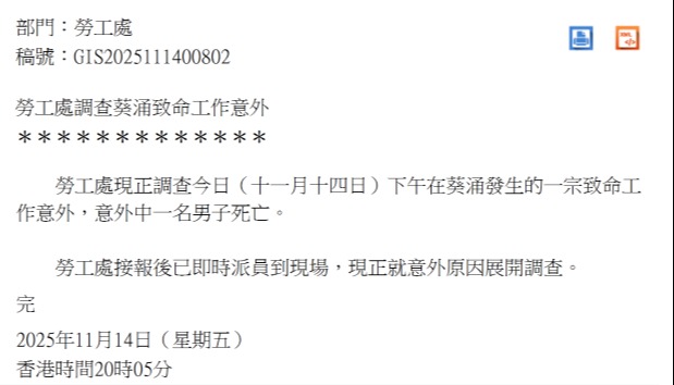 香港新聞網5月4日電 勞工處高度關注昨晚葵涌貨櫃碼頭發生的致命工作意外,意外中一名男工在維修路面時,被一部輪胎式龍門架起重機撞到,當場證實死亡。 勞工處表示,十分難過,並對家屬致以深切慰問。發言人說,在得知意外發生後,已即時派員到意外現場展開調查,並已向有關處所佔用人和承建商發出“暫時停工通知書”,停止使用涉事的輪胎式龍門架起重機處理貨櫃,以及進行混凝土底墊和輪胎式龍門架起重機道路的重建工程,直至當局信納有關處所佔用人及承建商已採取措施消除有關危害,才可復工。 勞工處說,正全速進行調查,以確定意外成因,查找有關持責者的法律責任,以及提出改善措施。若調查發現有違例事項,定會依法處理。就昨日的意外,勞工處會於日內在網頁發放“職安警示”及透過電子郵件通知持責者、工會和安全從業員專業組織等,提醒業界採取安全預防措施。 (完) 【編輯:黃璇】
