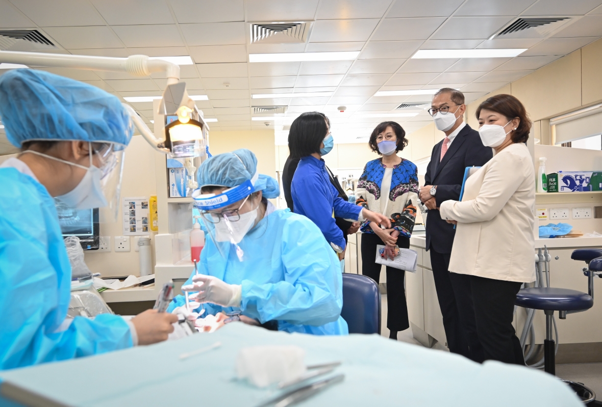 醫衞局局長盧寵茂(右二)和醫衞局副局長李夏茵(右一)到訪菲臘牙科醫院。 盧寵茂教授和醫衞局副局長李夏茵醫生在菲臘牙科醫院管理局主席王桂壎的陪同下,視察醫院的基層牙科診所、綜合牙科診所和模擬實驗室等設施,並聽取院長姚嘉榕教授介紹有關篩查教學病人的安排,以及醫院培訓牙醫和牙科輔助人員(包括牙齒衞生員和牙科治療師)的詳情。盧寵茂教授敦促醫院提升牙醫和牙科輔助人員臨床診治能力,確保可持續提供優秀的專業醫護以配合本港牙科服務需求增加。