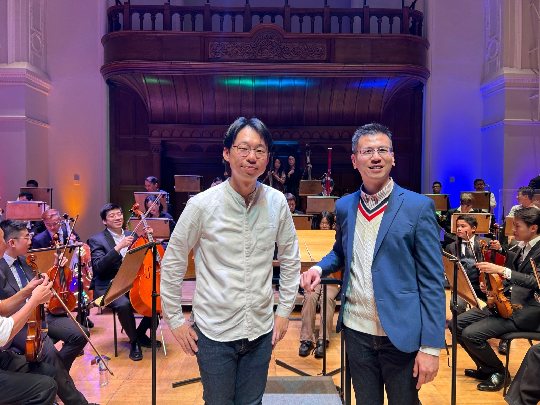 倫敦經貿辦處長羅莘桉(右)及首席指揮林屴汧合影。 首席指揮林屴汧帶領旅英港人音樂家以“一起走過的日子”為題,為倫敦觀眾帶來長達兩小時的粵語流行曲表演。該音樂會呈獻20首香港電影主題音樂,展示香港蓬勃的電影業以及作為“東方荷里活”的獨特地位。