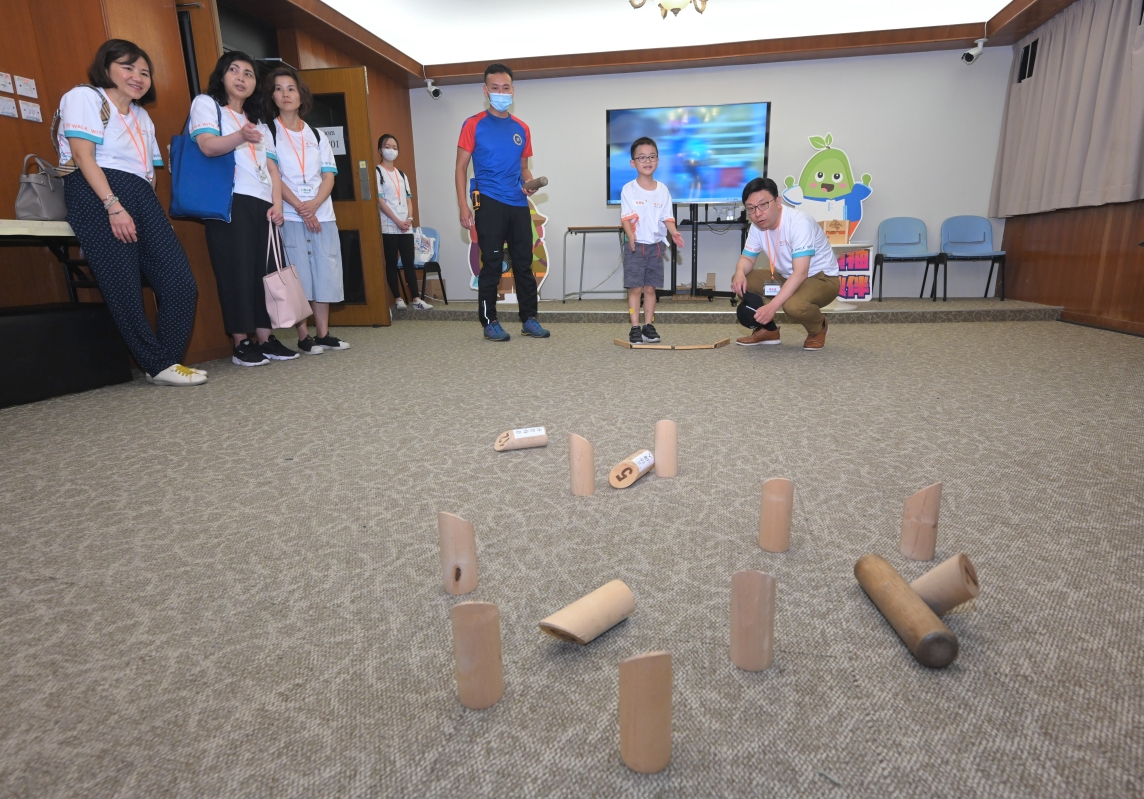 勞工及福利局局長孫玉菡(右一)與兒童體驗芬蘭木棋挑戰。 參加者先後在八鄉少訊中心參與熱身、歷奇和體驗活動,以互動有趣的形式體驗健康生活;其後由兒童事務委員會非官方委員主持各組分享環節,由參與兒童和家長分享日常生活的挑戰,以及家長在照顧有特定需要兒童時如何克服挑戰的體會,同時鼓勵家長多與孩子溝通和照顧自己的需要。 (完) 【編輯:黃璇】