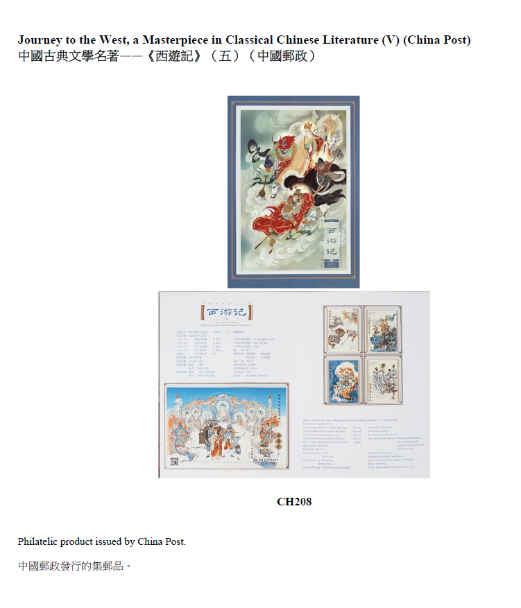中國郵政發行的集郵品。 中國郵政推出《中國古典文學名著——〈西遊記〉(五)》集郵品,是自2015年發行的《中國古典文學名著——〈西遊記〉》系列的第五組。這套集郵品生動傳神地描繪多個為人熟悉的故事情節和人物,讓人細賞這部經典小說。此外,今年適逢澳門中華總商會成立110周年和《中華人民共和國澳門特別行政區基本法》頒布30周年,澳門郵電局以此為題發行郵品,以作紀念。