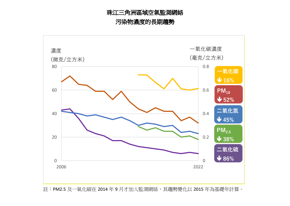 報告:珠三角地區空氣質素持續改善香港新聞網8月7日電 粵港澳今日(7日)共同發布粵港澳珠江三角洲區域空氣監測網絡2022年空氣質素報告,報告顯示珠江三角洲(珠三角)地區的空氣質素持續改善。 區域空氣監測網絡自2005年十一月啓動,監控的空氣污染參數包括三種空氣污染物(二氧化硫、顆粒物PM10和二氧化氮)及一種光化學次生空氣污染物(臭氧),2014年九月再加入兩種空氣污染物(一氧化碳和顆粒物PM2.5)的監測。五種空氣污染物均呈長期下降趨勢。與2006年相比,2022年錄得的二氧化硫、顆粒物PM10和二氧化氮的年均濃度值分別下降86%、52%和45%。與2015年相比,2022年錄得的一氧化碳和顆粒物PM2.5的年均濃度值分別下降了16%和38%;而2022年的臭氧年均濃度值較2006年則上升了39%,反映區域的光化學污染尚待改善。