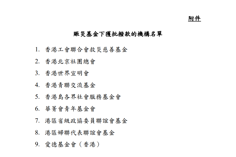 獲批撥款的機構名單 發言人表示,是次撥款彰顯香港與內地同胞血濃於水、守望相助的精神。特區政府希望撥款能為內地受災同胞提供適切援助,協助災區渡過難關,開展災後重建。 發言人強調,特區政府聯同賑災基金諮詢委員會會繼續密切留意災情及救援工作情況,並會稍後處理及審批其他機構提出援助災民的撥款申請,從速跟進。 賑災基金於1993年12月1日根據《公共財政條例》設立,為特區政府提供機制,回應有關在香港以外地方發生災禍的人道援助要求。(完) 【編輯:王瑶】